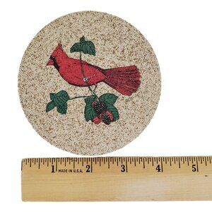 Natural Sandstone Coasters Set of 4 Red Cardinal Bird & Berries Cork Backing 4"