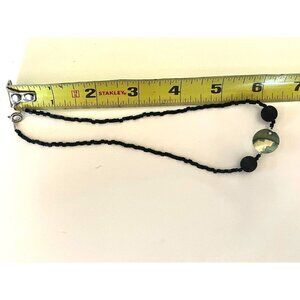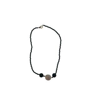 The necklace fits just around your neck; see measurement photos. I purchased it in Santorini, Greece, about 20 years ago. It is in good condition and has two black Santorini lava beads, a small circular pendant that feels like a shell, and tiny black beads. It's a unique but simple and classic necklace that looks great with a blouse or dress.