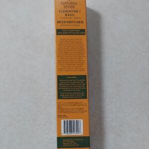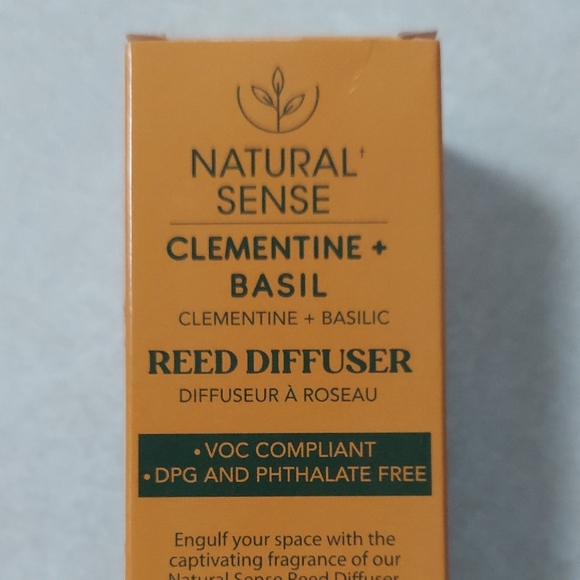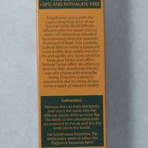 Natural Sense reed diffuser with clementine and basil scent. Features a sleek design with orange and green packaging.
