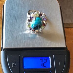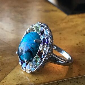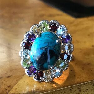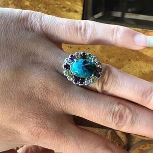 If you are looking for a rare, vibrant gemstone to add to your collection, this shadowkite ring may be a perfect addition. Shadowkite is a stone that is mined only in the table mountain range near Cape Town in South Africa. The stone is a unique blend of four other gemstones including malachite, chrysocolla, cuprite, and azurite. The stone is mined and simply polished for jewelry. It is not treated in any way and can be a natural combination of deep blue, light blue, copper reddish brown, and green. Each stone will be unique. This ring has a 14x10 mm earth mined shadowkite stone. The ring also has multi-gemstones to create the halo including natural topaz, garnet, peridot, citrine and amethyst. The ring is additionally set in solid .925 sterling silver with a platinum plate to prevent tarnishing. The ring in the photos is the actual one you will receive, so please see photos for gemstone quality and measurements. Size 7.