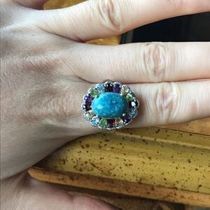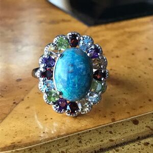 If you are looking for a rare, vibrant gemstone to add to your collection, this shadowkite ring may be a perfect addition. Shadowkite is a stone that is mined only in the table mountain range near Cape Town in South Africa. The stone is a unique blend of four other gemstones including malachite, chrysocolla, cuprite, and azurite. The stone is mined and simply polished for jewelry. It is not treated in any way and can be a natural combination of deep blue, light blue, copper reddish brown, and green. Each stone will be unique. This ring has a 14x10 mm earth mined shadowkite stone. The ring also has multi-gemstones to create the halo including natural topaz, garnet, peridot, citrine and amethyst. The ring is additionally set in solid .925 sterling silver with a platinum plate to prevent tarnishing. The ring in the photos is the actual one you will receive, so please see photos for gemstone quality and measurements. Size 10.