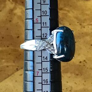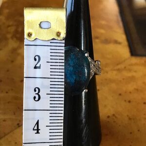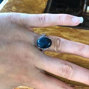 If you are looking for a rare, vibrant gemstone to add to your collection, this shadowkite ring may be a perfect addition. Shadowkite is a stone that is mined only in the table mountain range near Cape Town in South Africa. The stone is a unique blend of four other gemstones including malachite, chrysocolla, cuprite, and azurite. The stone is mined and simply polished for jewelry. It is not treated in any way and can be a natural combination of deep blue, light blue, copper reddish brown, and green. Each stone will be unique. This ring has a large 12.05 ctw earth mined shadowkite stone with natural white zircon accents. The ring is additionally set in solid .925 sterling silver with a rhodium plate to prevent tarnishing. The ring in the photos is the actual one you will receive, so please see photos for gemstone quality and measurements. New, worn for photos only. Size 6.