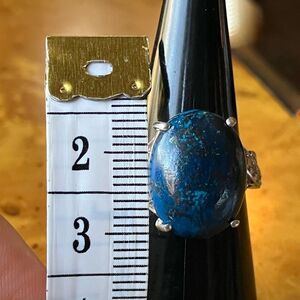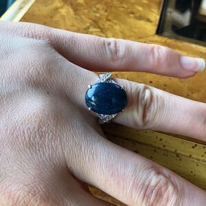 If you are looking for a rare, vibrant gemstone to add to your collection, this shadowkite ring may be a perfect addition. Shadowkite is a stone that is mined only in the table mountain range near Cape Town in South Africa. The stone is a unique blend of four other gemstones including malachite, chrysocolla, cuprite, and azurite. The stone is mined and simply polished for jewelry. It is not treated in any way and can be a natural combination of deep blue, light blue, copper reddish brown, and green. Each stone will be unique. This ring has a large 12.05 ctw earth mined shadowkite stone with natural white zircon accents. The ring is additionally set in solid .925 sterling silver with a rhodium plate to prevent tarnishing. The ring in the photos is the actual one you will receive, so please see photos for gemstone quality and measurements. Size 6.