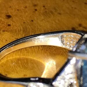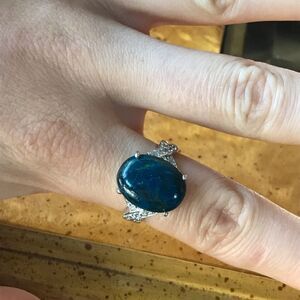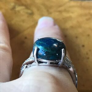 If you are looking for a rare, vibrant gemstone to add to your collection, this shadowkite ring may be a perfect addition. Shadowkite is a stone that is mined only in the table mountain range near Cape Town in South Africa. The stone is a unique blend of four other gemstones including malachite, chrysocolla, cuprite, and azurite. The stone is mined and simply polished for jewelry. It is not treated in any way and can be a natural combination of deep blue, light blue, copper reddish brown, and green. Each stone will be unique. This ring has a large 12.05 ctw earth mined shadowkite stone with natural white zircon accents. The ring is additionally set in solid .925 sterling silver with a rhodium plate to prevent tarnishing. The ring in the photos is the actual one you will receive, so please see photos for gemstone quality and measurements. New, worn for photos only. Size 8.