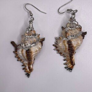 keywords: shell earrings, silver accents, natural shell jewelry, seashell earrings, dangle earrings, beach jewelry, lightweight earrings, hook closure earrings, seaside style, coastal accessory, boho chic earrings, earthy tone jewelry, unique gift item
