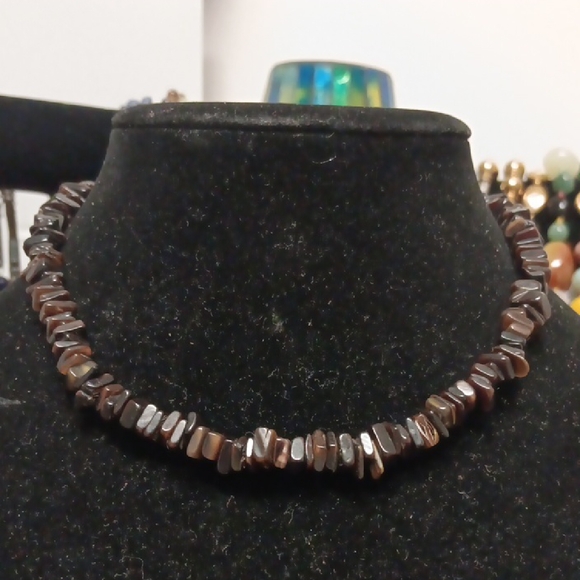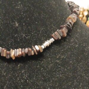 Elegant brown stone chip necklace for women. The neutral brown beads offer a warm, natural look. Versatile piece that pairs well with casual and dressy outfits. Lightweight and comfortable for everyday wear.