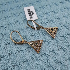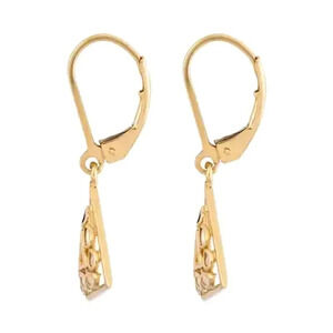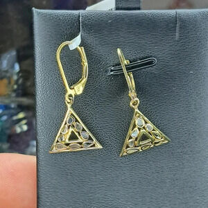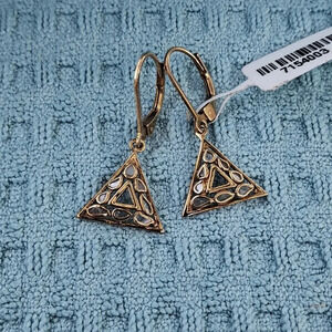 Gorgeous Natural Sliced Polki Diamond Individually Bezel Set In Trillion Shaped Dangle With Beautiful Handcrafted Metal Work. Lever Back Post Earrings In 14kt Yellow Gold Over 925 Sterling Silver.