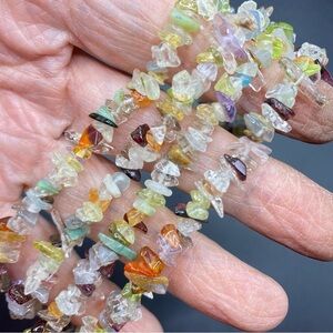 Natural Small Chips Over-The-Head Necklace. Measures 34" and is over-the-head style. Many types of stone chips as well as crystal. Very nice necklace, doesn't show wear. Cute Boho style. #14