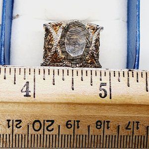 This rare gemstone is one that you will not see very often. The Quartz has natural Rutile threads running through the gemstone and it is set in a very unique and fancy openwork setting with two diamond accent gems. The quartz is usually clear but what makes this ring so unique is the smoke gray color of the quartz. It is heavy in 925 silver at 10 grams which is coated with 14K Yellow Gold vermeil. The main gem is a darker smoke gray than in the photos as they were taken under bright led lights.