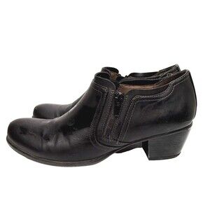 Naturalizer Natural Soul Kasta ankle booties in women's size 8.5 offer comfort and classic style with an almond toe, 2" block heel, and side zip closure. These black faux leather booties have uppers in excellent shape with only minor scuffs near the heel. Block heels show wear to the black finish, and soles have some wear but still plenty of life left. Great for work or casual wear, these boots are known for cushioned insoles and all-day support. A stylish low ankle boot perfect for fall through spring.