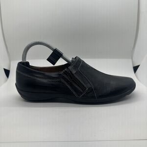 These are Natural Soul slip-on loafers in black, designed for women in size 9 US / 7 UK. They offer comfort with a leather upper, making them suitable for casual wear. The brand is Natural Soul by Naturalizer, and they have a nature-themed style.