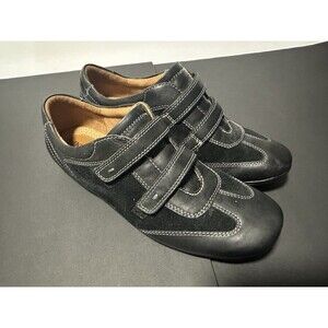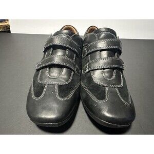 Natural Soul by Naturalizer black suede and leather slip-on comfort shoes, size 8M. These shoes feature a stylish design with white contrast stitching, a leather upper with suede accents, and an adjustable hook-and-loop closure for a secure fit. Designed for comfort, they are perfect for everyday wear. The rubber outsole provides good traction. Made in China. Excellent pre-owned condition with minimal signs of wear. 1079-3