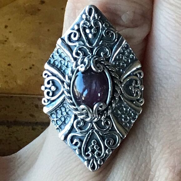 A star ruby is one of the most rare gemstones, even more than the star sapphire. This ring is made with a genuine, earth mined star ruby that measures 9x7 mm. The ring is set in solid .925 sterling silver, and it has beautiful filigree work on the face and sides of the ring. Please see photos for gemstone quality and measurements. The ring in the photos are the actual ones you will receive :) Photos taken with and without flash. New, worn for photos only. Size 6.