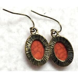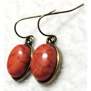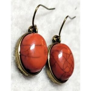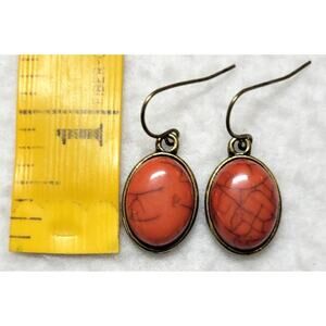 Natural Stone Agate Red Orange Oval Silvertone Earrings Western Boho Rustic.