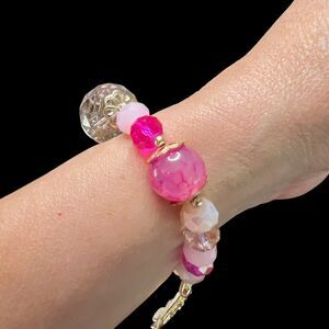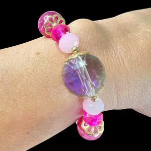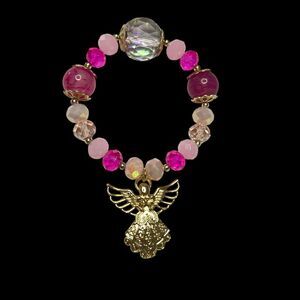 Style: Charm, Beaded Type: Bracelet Color: Pink Main Stone Color: Purple Material: Natural Stone, Crystal Metal: Gold Plated Main Stone: Crystal Secondary Stone: Natural Stone Charm Type: Dangle Shape: Round Main Stone Shape: Round Country of Origin: United States Beaded bracelet, angel charm bracelet, pink bracelet, purple bracelet, crystal bracelet, gemstone bracelet, women's bracelet, handmade bracelet, jewelry, gift for her, fashion bracelet, stretch bracelet, beaded jewelry, angel jewelry, charm bracelet