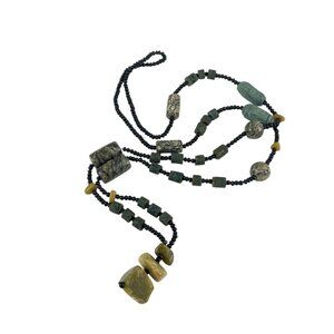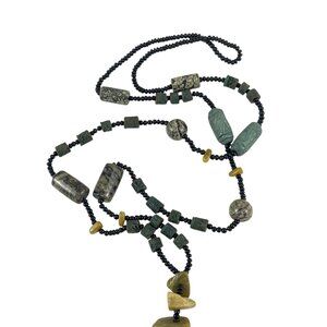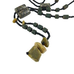 This handcrafted necklace is a celebration of nature's artistry, featuring an eclectic mix of polished green and yellow stones. Each bead tells a story of earth's wonders, enhanced by intricate black beading that provides a stunning contrast. It effortlessly complements bohemian, earthy, or artistic styles, creating a timeless accessory that captures attention.