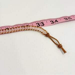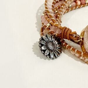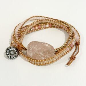 Elegant wrap bracelet featuring a rose quartz centerpiece and leather band. Perfect for adding a touch of pink and tan to any outfit.