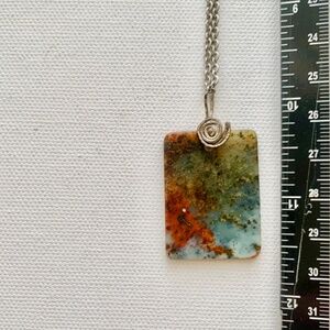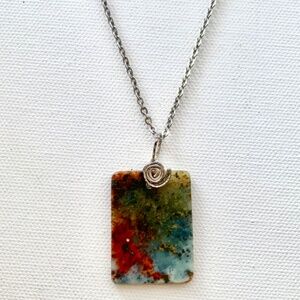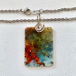 Add a touch of nature to your jewelry collection with this beautiful pendant necklace. The rectangular-shaped pendant features natural stone or fossilized plant life in a stunning multicolor design. The pendant hangs from a stainless steel chain, making it a perfect accessory for any occasion. Get ready to receive compliments with this unique and stylish piece.