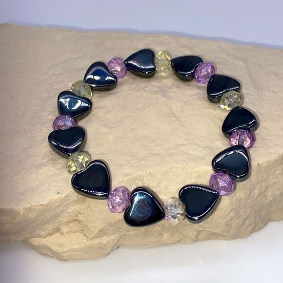 ✨🆕✨ Genuine Black Hematite Heart Stones Purple + Iridescent Spacers STRETCH Bracelet✨