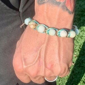 This bracelet is made with Amazonite beads. Amazonite is a soothing stone and is believed to have many metaphysical powers. Amazonite stones are also thought to have tremendous healing abilities. It calms the brain and nervous system and aids in maintaining optimum health. Balances the masculine and feminine energies. Additionally, Amazonite is associated with money, luck and overall success.