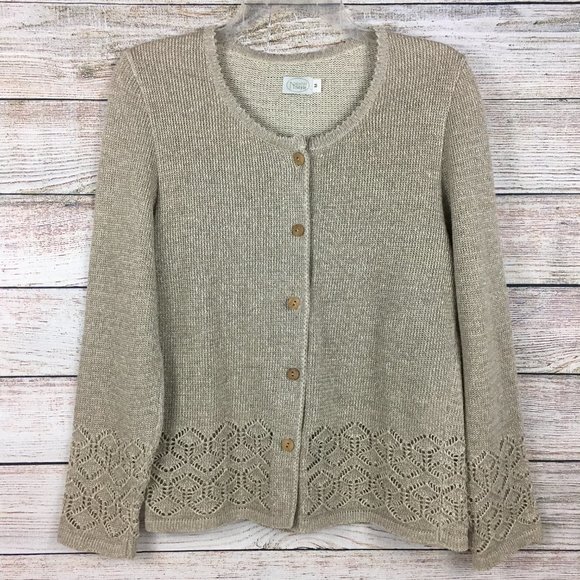 Beige/Tan, button front, bottom and sleeves have an open weave embellished design