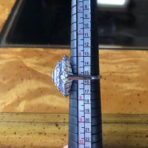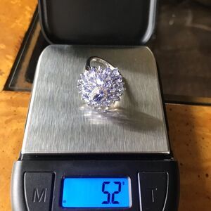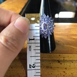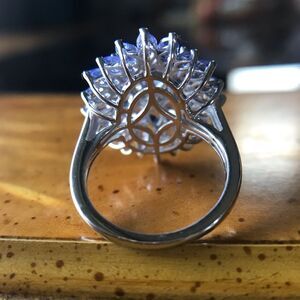 This beautiful cocktail ring is made with 4.35 carats of real, earth mined tanzanite. The ring is set in solid .925 sterling silver, and it also has a platinum plate to prevent tarnishing. Please note, all photos were taken indoors in indirect sunlight without flash. In person, the stones are more purple/violet versus blue. Please see photos for measurements. Size 7.