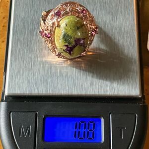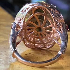 This beautiful ring is made with genuine Tasmanian stichtite and garnet. The stitchtite is very nice sized, measuring about 19x14mm. The ring is set in solid .925 sterling silver with a rose gold vermeil. The ring is designer stamped STS and .925. This is a very beautiful, unique piece. The ring in the photos is the actual one you will receive, so please see photos for gemstone quality and measurements. Size 9. Excellent vintage condition.
