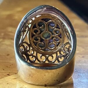 This beautiful ring features a 17x13 mm earth mined, Tasmanian Stichtite stone. The ring has gorgeous filigree work on it, and it has a face measurement of just over an inch. The metal is solid .925 sterling silver with a yellow gold vermeil. If you are looking for a unique statement piece, this one may be perfect for your collection. To verify quality, the ring is additionally designer stamped STS 925. The ring in the photos is the actual one you will receive, so please see photos for quality and measurements. Size 7. Excellent vintage condition.