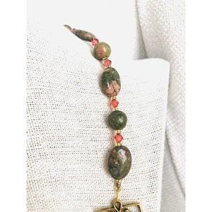 Polished unakite beads with pink crystal beads in between. Seed beads separate all the beads. Made very well with a unique clasp. No flaws great condition