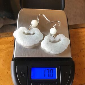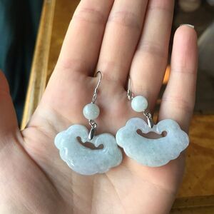 These beautiful, carved earrings feature 50 ctw of completely natural, earth mined jade. The stones have not been enhanced in any way. The earrings are carved into a cloud design and together weigh around 17 grams. The earrings are set in solid .925 sterling silver with a rhodium finish. The earrings in the photos are the ones you will receive, so please see photos for gemstone quality and measurements.