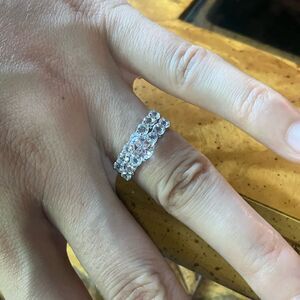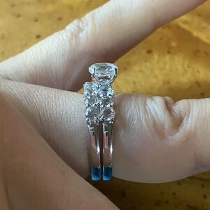 This listing includes both rings. The gemstones in this ring set are natural, earth mined white topaz. The large topaz measures 6mm, and the small stones measure 3mm each. Topaz is an 8 on the Mohs scale, making it durable and perfect for regular wear. The rings are set in solid .925 sterling silver with a platinum plate to prevent tarnishing. The rings can be worn separately or together. This is a beautiful set. Size 6.