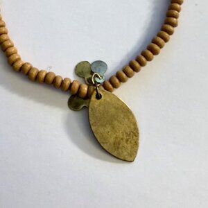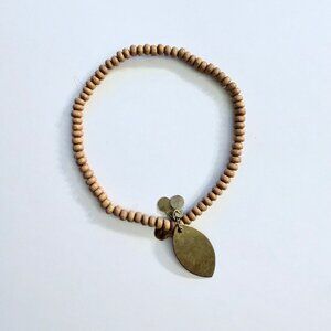 Natural Wood Beaded Stretch Bracelet Brass Leaf Charm Boho Cottagecore