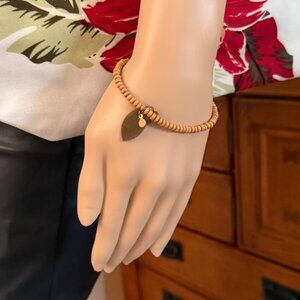 A versatile accessory, this bracelet features natural wood beads and a brass leaf charm. Its minimalist design makes it suitable for any wardrobe. Whether you want to show your love of nature, your boho style, accessorize your rustic prairie outfit, or your cottagecore aesthetic; you are set with this lightweight stretch bracelet.