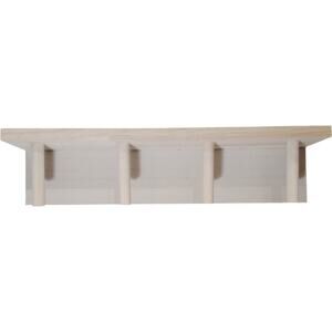 Functional wall-mounted coat rack crafted from natural wood with four upward-angled pegs for secure hanging. Shelf surface features a light white stain, while the remainder showcases multi-tone natural wood suitable for staining or painting. Measures 13" long x 3" deep x 3" tall. Ideal for entryways, mudrooms, or utility spaces. Unmarked surplus item.