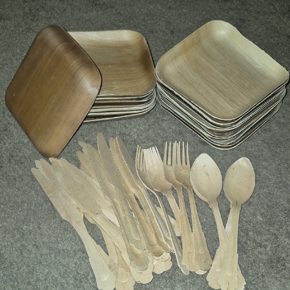 Square wooden plates with matching cutlery. Ideal for sustainable dining. More plates & knives than anything else.