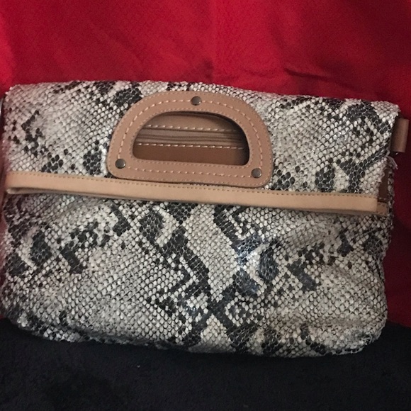 Roomy snake skin clutch that has a convenient shoulder strap, with a pouch on backside.