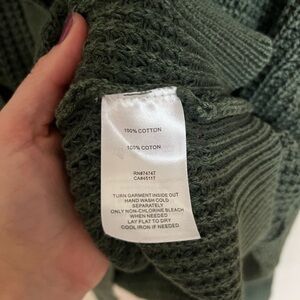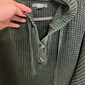 Cozy green ribbed knit hoodie sweater with button details. Perfect for casual wear.