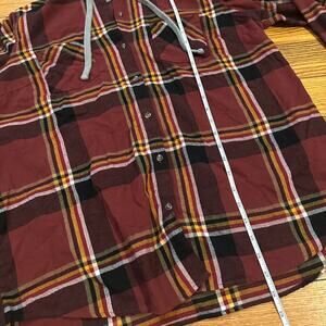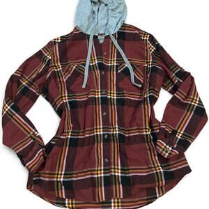 burgundy, plaid, hoodie shirt, casual, multi-coloured, relaxed fit, outdoor style, layered look, fleece-lined, streetwear