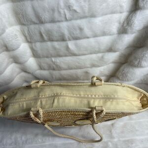 Natural straw bucket style tote bag with rope straps with gold tone accents.top zipper the inside lining has a side zipper pre owned in good used condition normal small transfer marks on the inside lining see all pictures any questions please message.