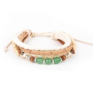 Featuring cork, thread, and wood, mismatched metallic accents, glassy jade stones, and wood beads adorn earthy layers around the wrist for a whimsical look. Features an adjustable sliding knot closure. Three different textures make this bracelet fun and unique. The stones and wooden beads compliment each other to make this a fun piece.