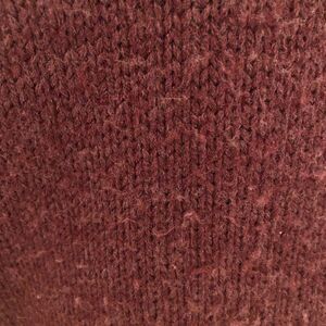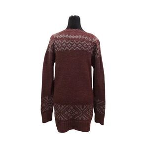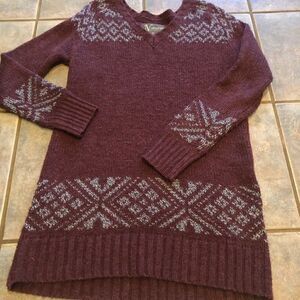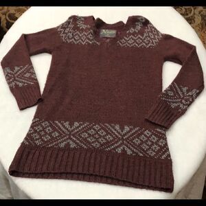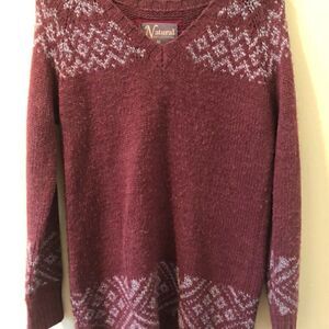 Natural Reflections sweater. Long maroon/wine colored v-neck with gray designs at collar, bottom and sleeves. Very warm addition to any closet! Sweater is in good used condition, some pilling on front (shown in pictures). Size M.