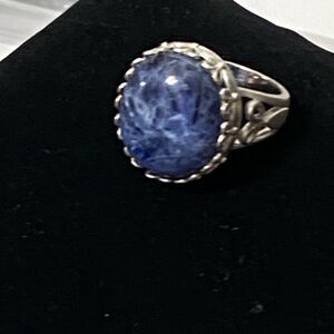 Artisan designed and made. A natural stone blue sodalite encased in bows of sterling silver ring!