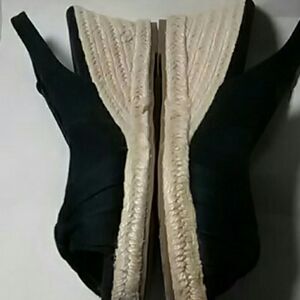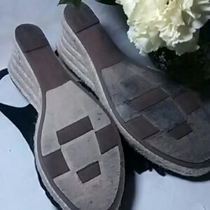 Worn once, great black fabric, peep toe, bow in front, woven covered wedge. .75 platform, padded foot bed. Size 7.5 measures 10.5 long, 3.5 wide, 2.5 high over .75 platform. So cushy and comfy. And perfect with everything spring and summer