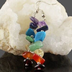 Spruce up and shimmer your ensemble for any special occasion with these spectacular Brand New Womens 7 Multi Color Chakra Crystal Gemstone Dangle Statement Earrings.