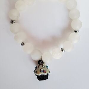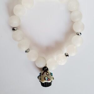 Natural White Quartz Stone Beaded Stretch Gemstone Bracelet w/Cupcake Charm NEW