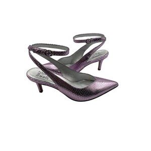 purple heels, size 7, metallic shoes, snake embossed, pointed toe, ankle strap, party heels, formal footwear, women's shoes, size 7, stylish pumps,
