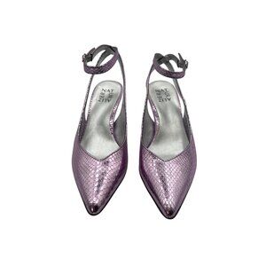 Make a bold entrance in these eye-catching Naturalizer metallic purple heels. Featuring a pointed toe, ankle strap with buckle, and snakeskin-textured finish, these dress shoes combine statement-making style with Naturalizer's signature comfort. Purple