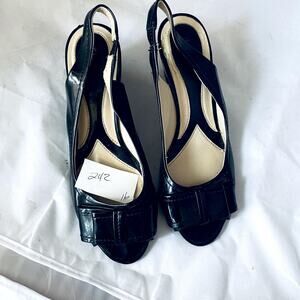Naturalizer No 5 comfort Black women's wedge heels. Slingback with give, 2.5" wedge, bow on top of open toe, Flaws- inside the material is cracked as shown in pictures. wear on heels. BURLONE 45302001 size 7M