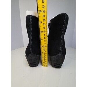 These Naturalizer Ankle Boots in size 9.5 feature a sleek black suede design with a waterproof finish by Scotchguard. The wedge heel and foam insole provide comfort and support. The toe shape and zip closure add to the stylish and practical features of this versatile bootie. Ideal for fall, winter, and spring, these boots are a must-have for any woman's shoe collection.