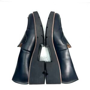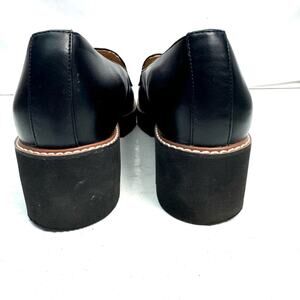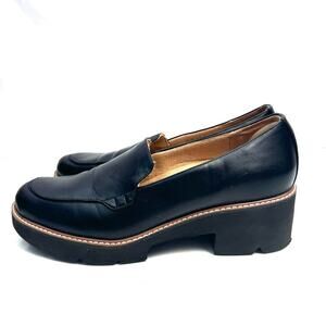 Excellent used condition! Super lightweight faux leather loafers. Lug sole with a small platform and chunky heel. Thin contrast stitching on mid soul with an almond shaped toe. Platform height of 1 inch and heel height of 2 inches.